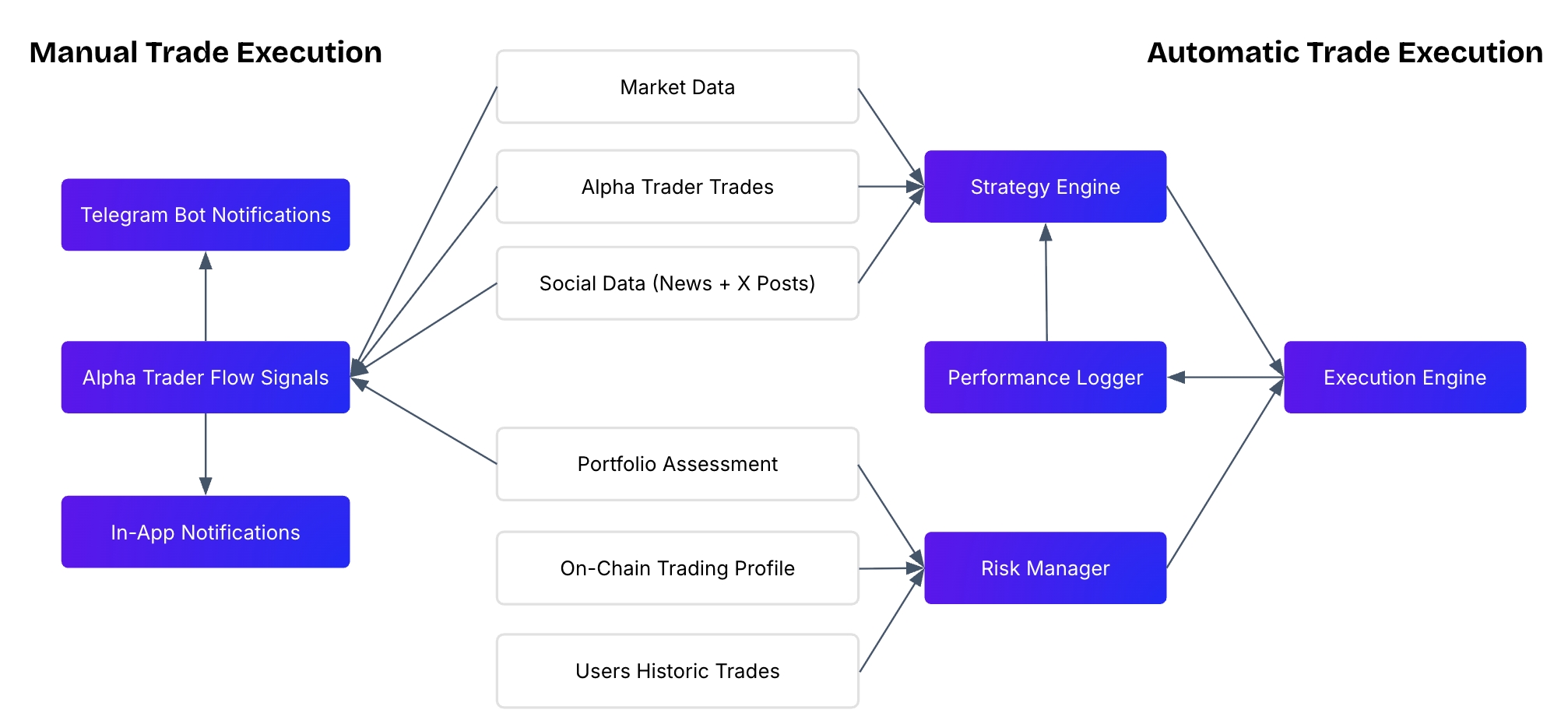 QuantHive’s architecture is designed to support both manual and automated trade execution, giving users full control or full automation based on their preferences. Users can manually act on real-time trading signals generated from aggregated alpha trader wallet activity.