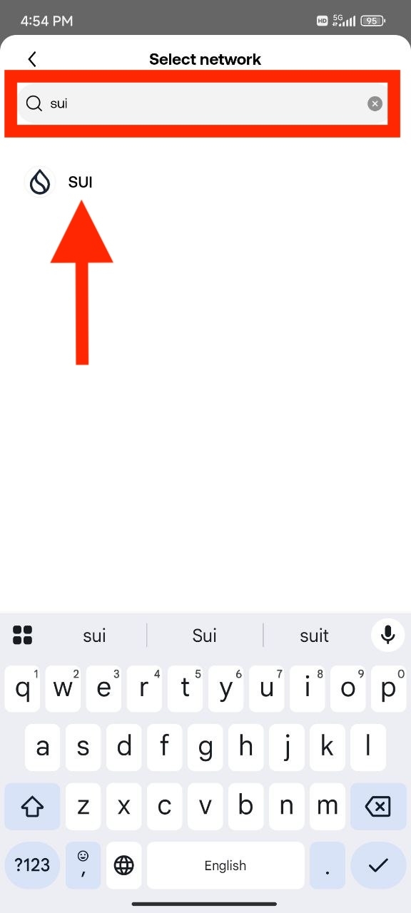 Step 8: A network selection window will appear. Key in "Sui" into the search field. Then, tap on SUI to select the network.