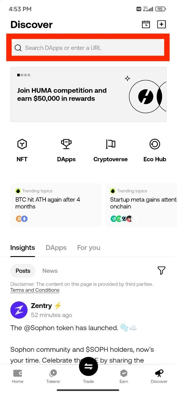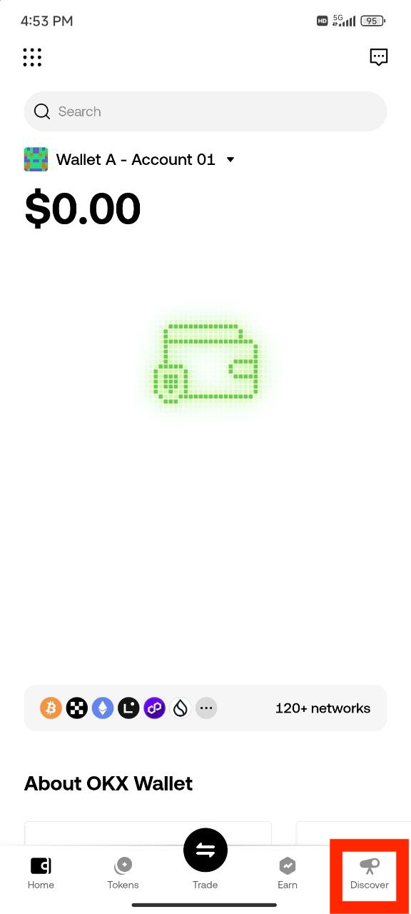 Step 1: Launch OKX wallet on your mobile phone and tap on the Discover tab below.