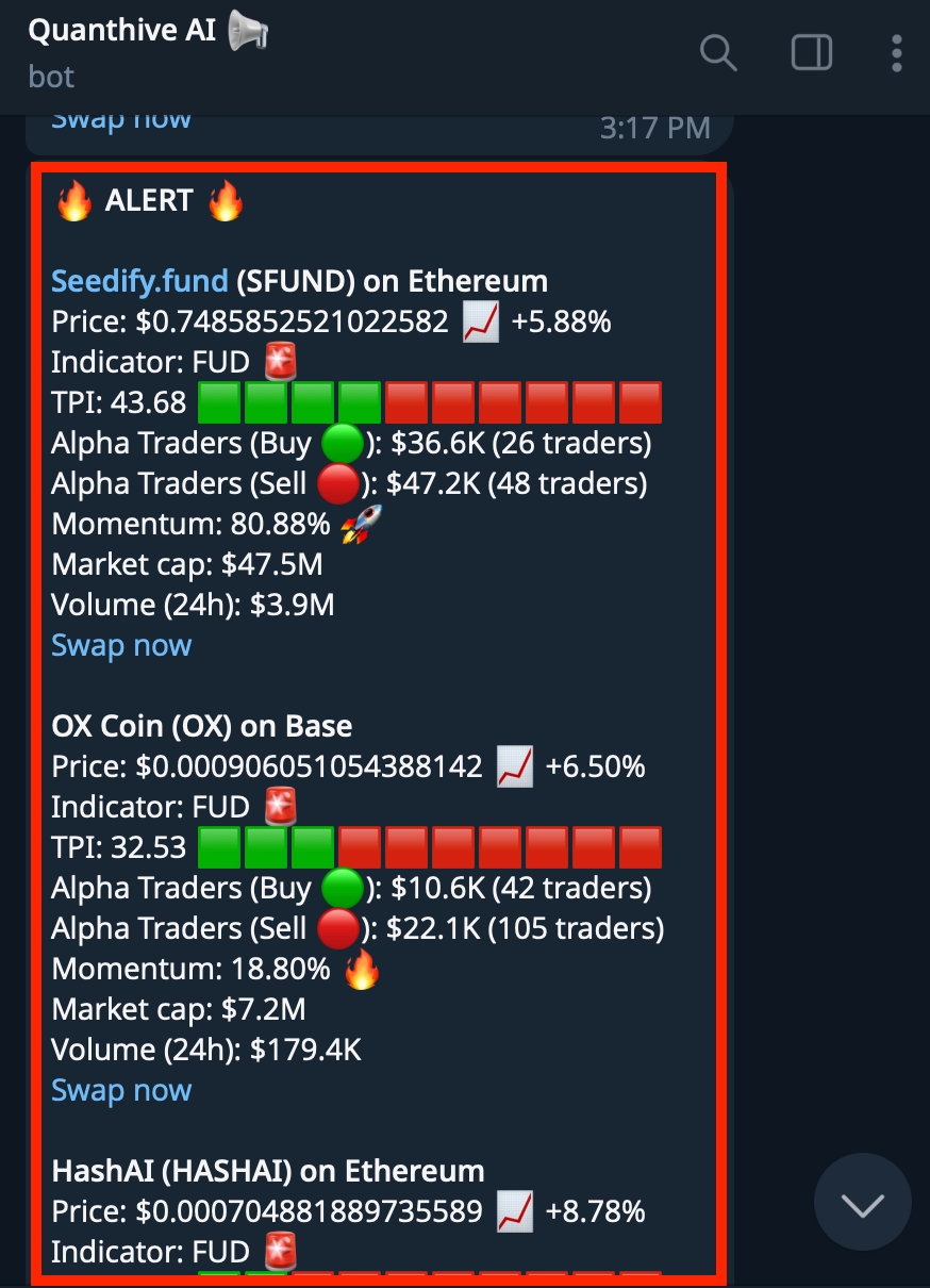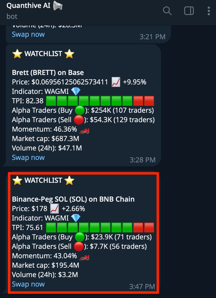 Step 6: Whenever QuantHive sends an alert, you will receive a direct message from the bot @quanthive_bot with Alpha Trader Flow signal notifications and watchlist alerts.