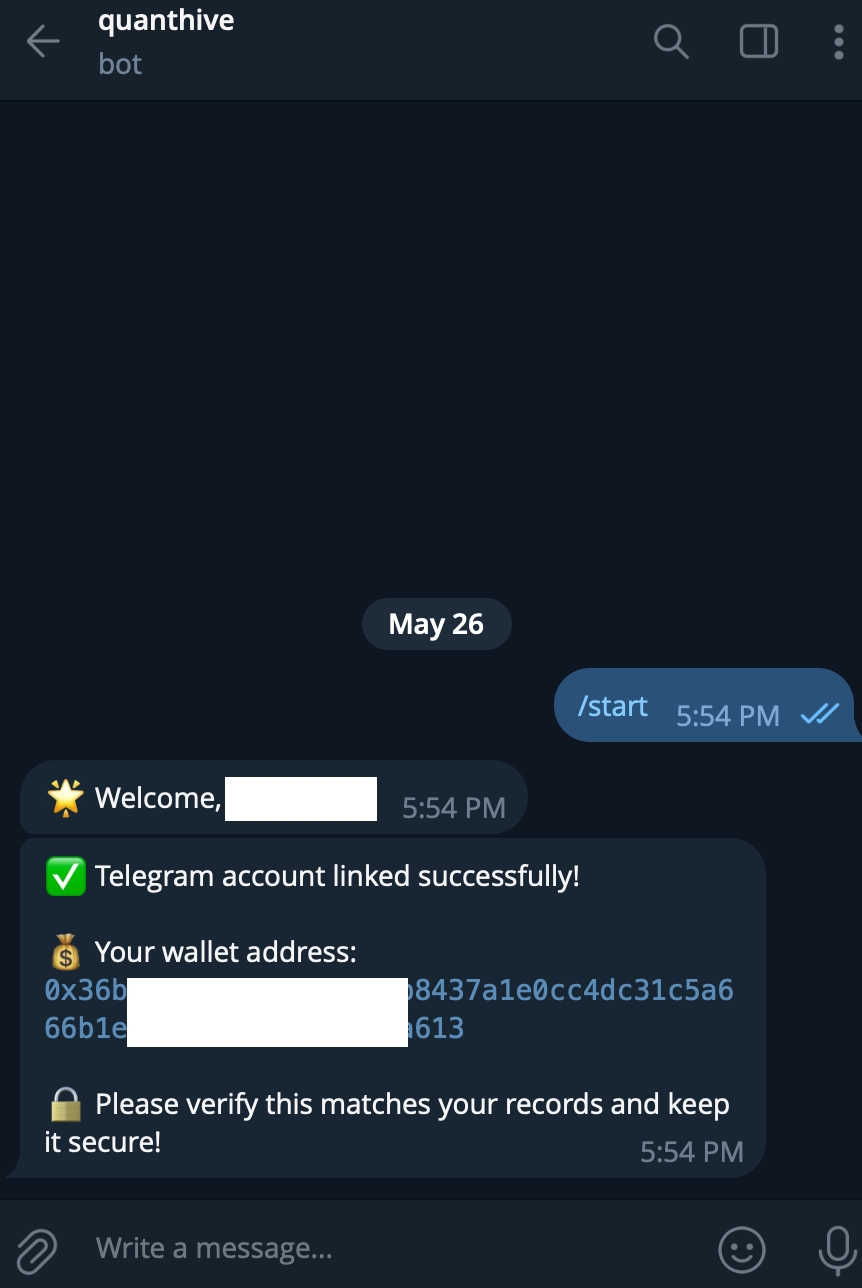 Step 5: Once you see this reply from the bot, it means your Telegram username has been successfully linked to your QuantHive account.