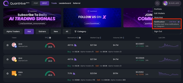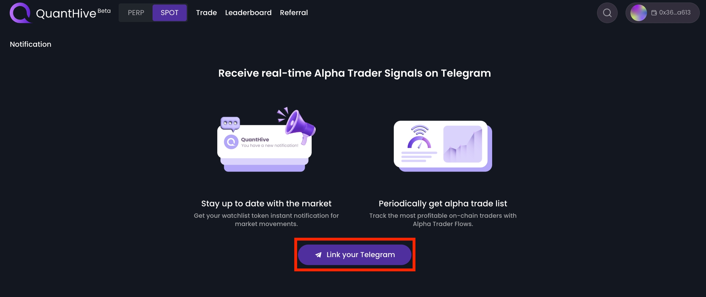 Link your Telegram account to QuantHive to receive instant notifications for Watchlist Alerts and Alpha Trader Flow Signals. This quick guide will walk you through the simple steps to connect your Telegram and never miss an important market update.