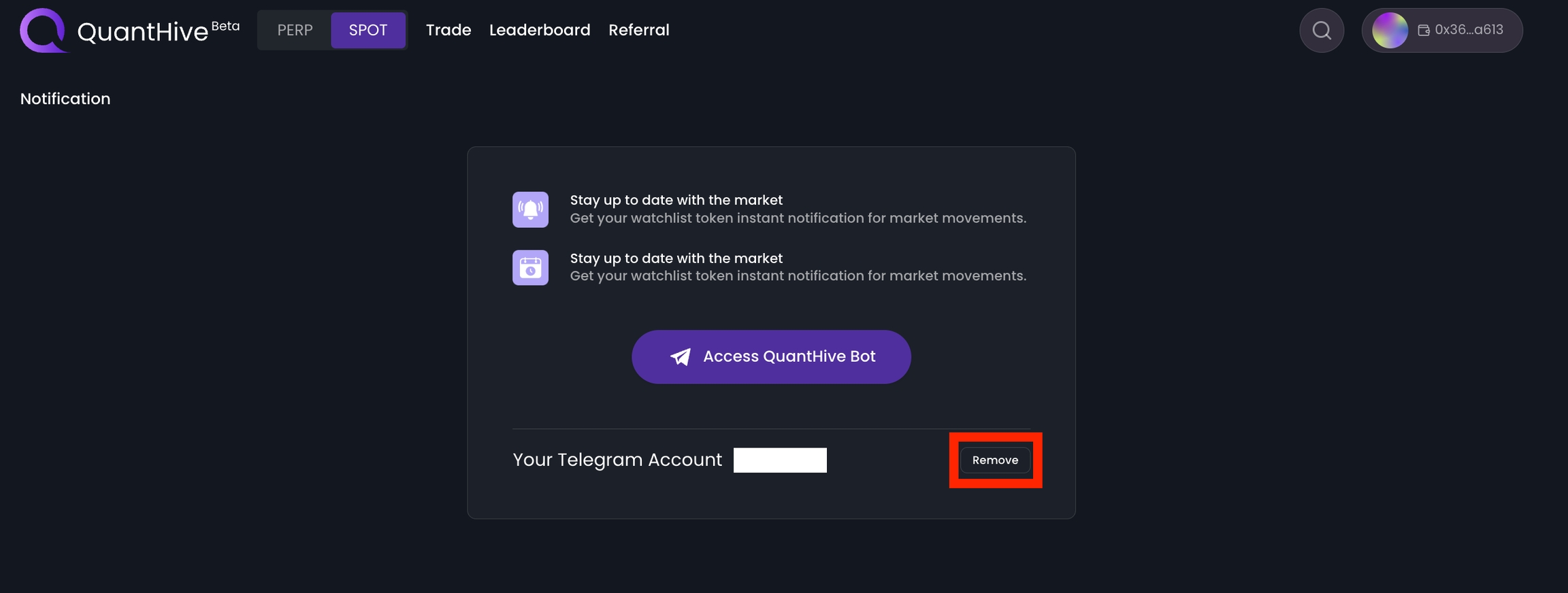 Note: To unlink the Telegram bot from your account, repeat Step 2, then click the Remove button to disconnect your Telegram account from QuantHive.