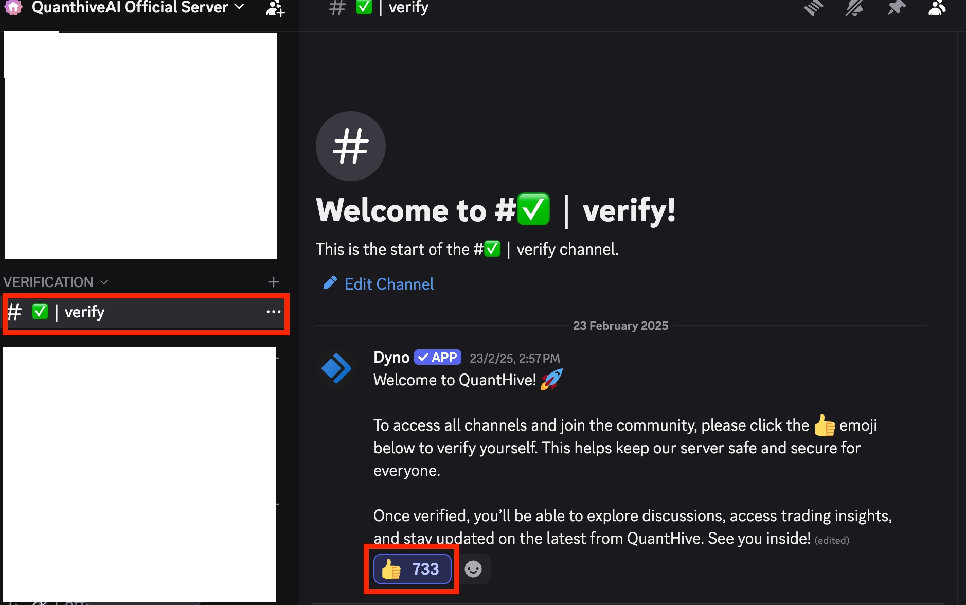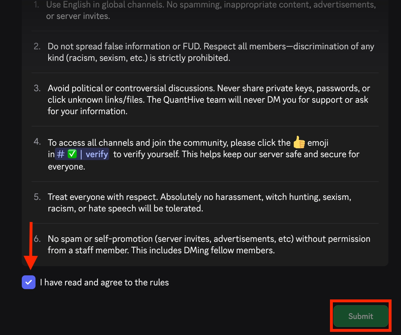 Join our Discord server: https://quanthive.ai/discord Check the box that says "I have read and agree to the rules," then click the Submit button.