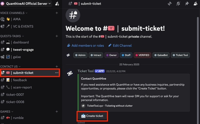 #submit-ticketchannel and click the Create Ticket button. This will open a private support channel between you and the team.