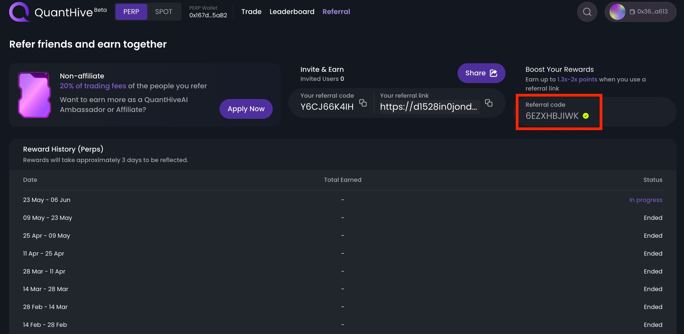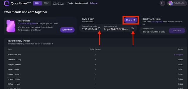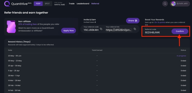 Step 4: Ask your friend to sign up on QuantHive using your referral link, or simply have them enter your referral code into the Referral Code field under Boost Your Rewards, then click Confirm.
