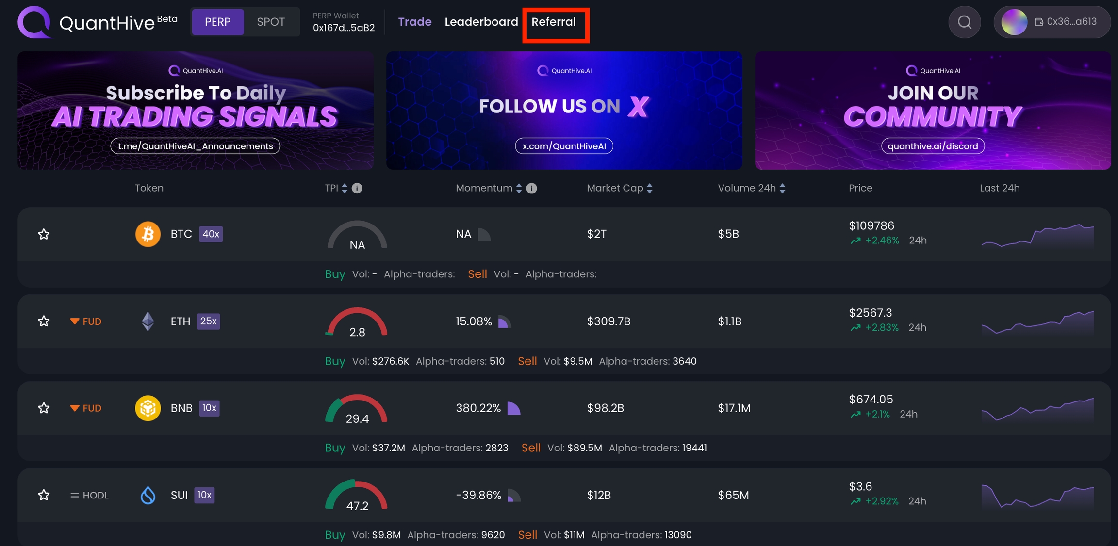 Once linked, you will earn 20% of your friend’s trading fees on QuantHive, rewarded to you every bi-weekly.
