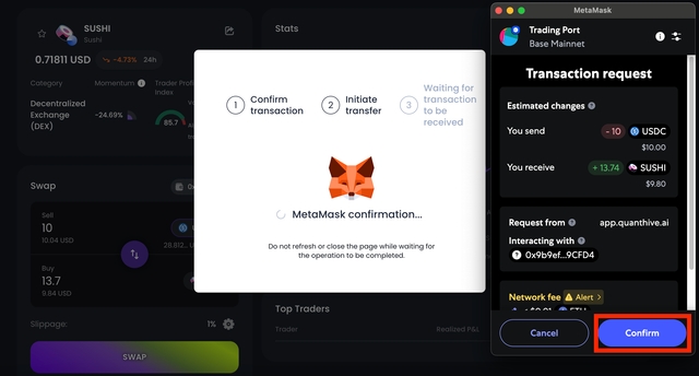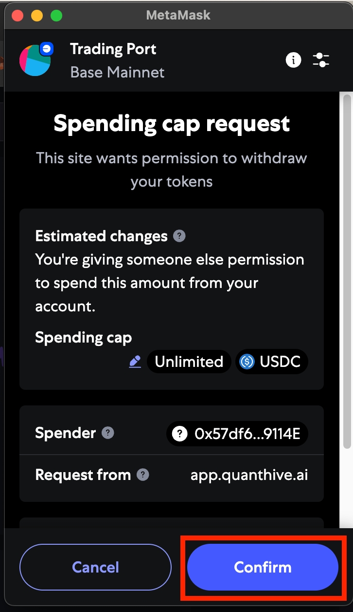 Step 7: If this is your first time spending this token (eg. $USDC) on QuantHive, your wallet will prompt a spending cap approval. Click Confirm to proceed.