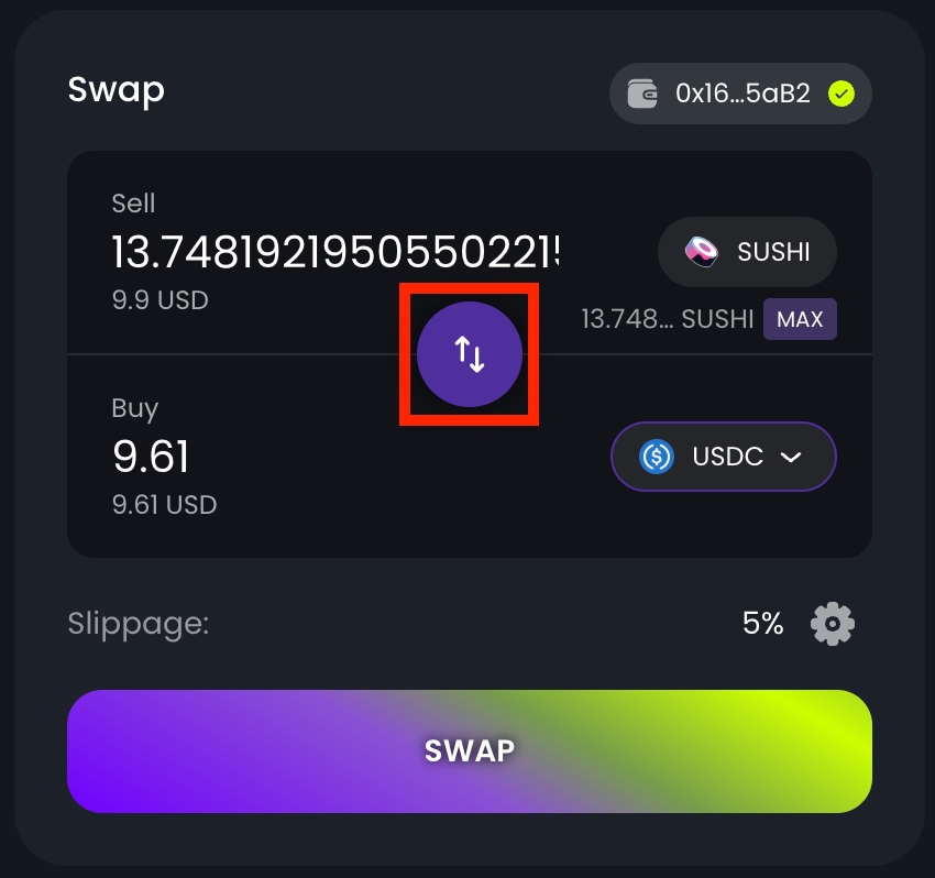 To sell a token, click the rotate button in the middle of the swap module to switch the swap direction. If you want to sell your entire balance, click the MAX button.