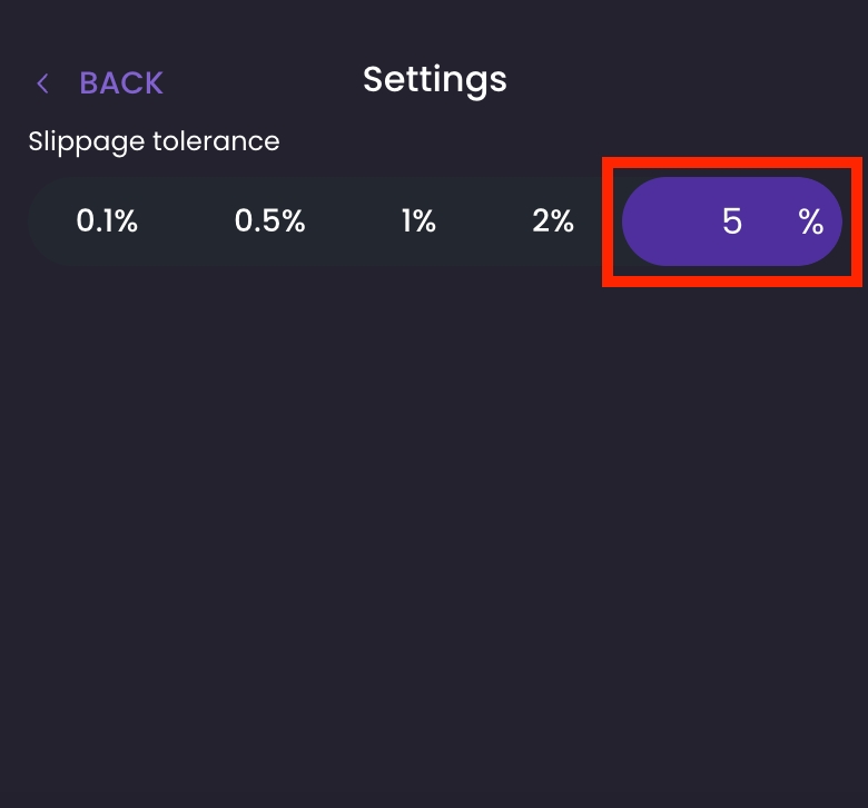 Step 2: A slippage tolerance settings window will appear. You can select any higher slippage percentage here directly by clicking on them or select the custom input field on the right side to key in any amount you want.
