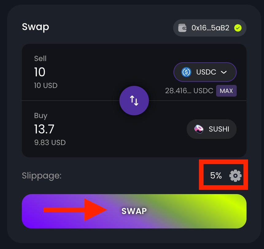 Note: Make sure your wallet has been funded with the correct tokens on the network you are swapping on, in order to pay for gas fees. Otherwise, your transactions will fail.