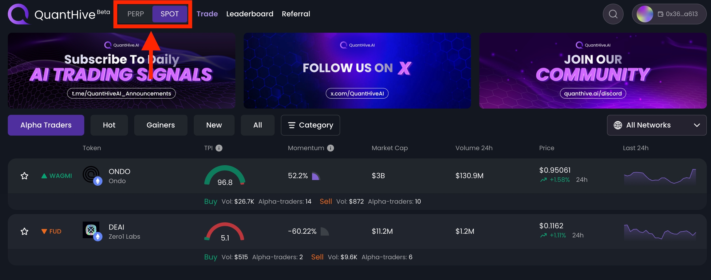 QuantHive offers a powerful platform for both spot and perpetual (perp) trading, combining AI-driven insights with seamless on-chain execution. For spot trading, users can access omni-chain swaps across supported networks with real-time smart money signals and token safety checks.