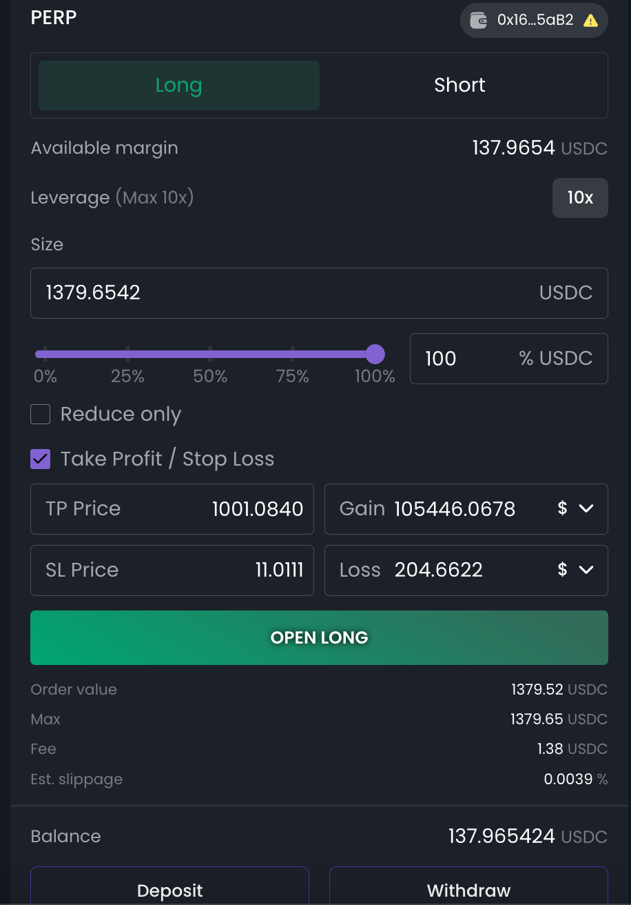 Deposit or withdraw funds directly to and from the Perp wallet.